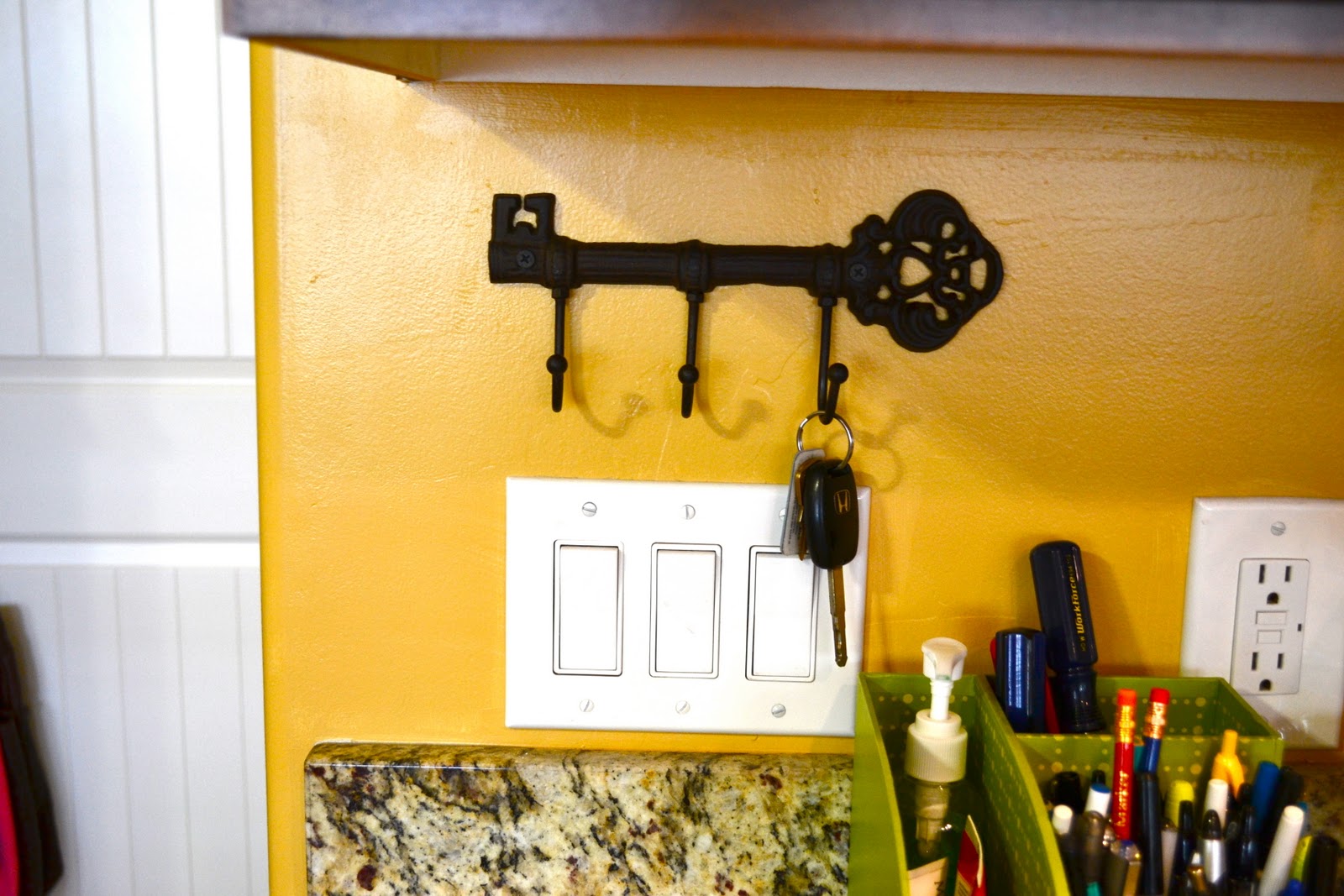 I bought one of these key hanger things! This spot on my kitchen counters is always piled HIGH with Stuff, Stuff from everywhere. It's the biggest catch-all in the whole house. So now I have a place for the keys that always get lost in the 'stuff'.