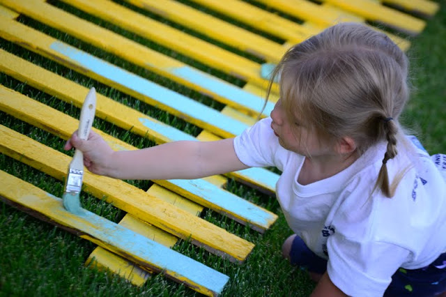We had fun painting the fence. Once the paint went on I kind of liked the yellow showing through, it made it look 'weathered'. so we were pretty sloppy and didn't try to cover every inch.